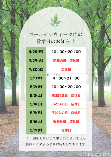 水曜日・祝日は店休日(ただし土曜日が祝日の場合は営業いたします)